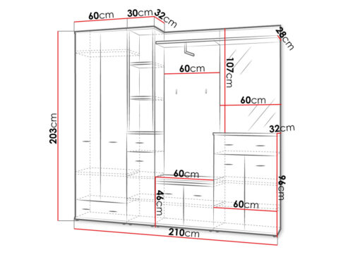 - ווי תליית מעילים / תיקים: רוחב: 85 ס"מ, גובה: 82 ס"מ, עומק: 15 ס"מ