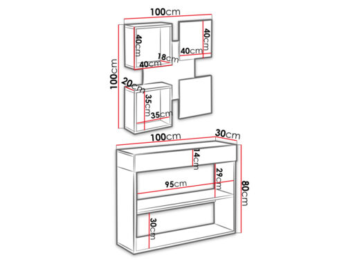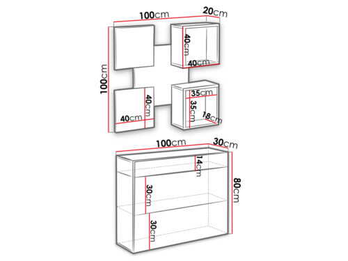 - ארון תלוי: רוחב: 100 ס"מ, גובה: 60 ס"מ, עומק: 30 ס"מ