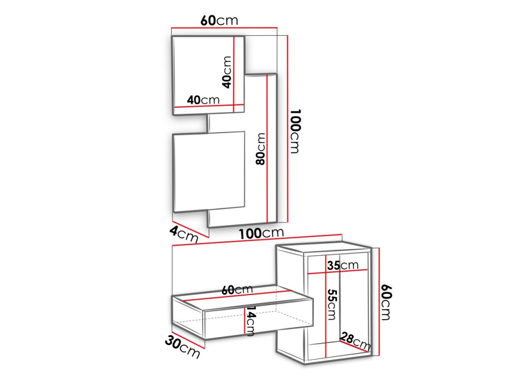 - ארון תלוי: רוחב: 100 ס"מ, גובה: 60 ס"מ, עומק: 30 ס"מ