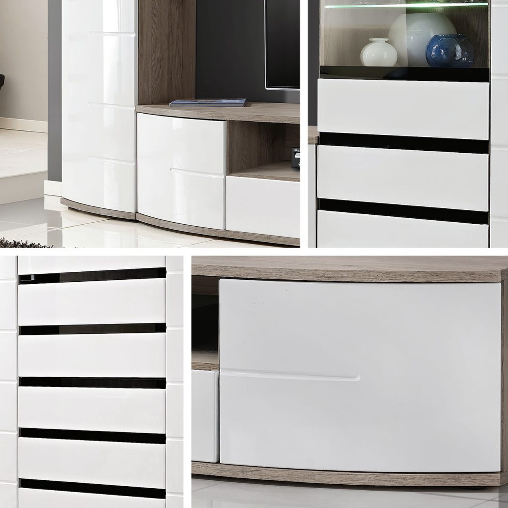 היתרון של מערכת הקיר הוא גם בתאים מרווחים. ארונית הטלוויזיה הארוכה, בנוסף למקום הפתוח לציוד טלוויזיה, מציעה גם שני תאים נפתחים. כל אחד מהם הוא מקום מסתור מושלם לאוסף סרטים, משחקים, תקליטורים או אוזניות.