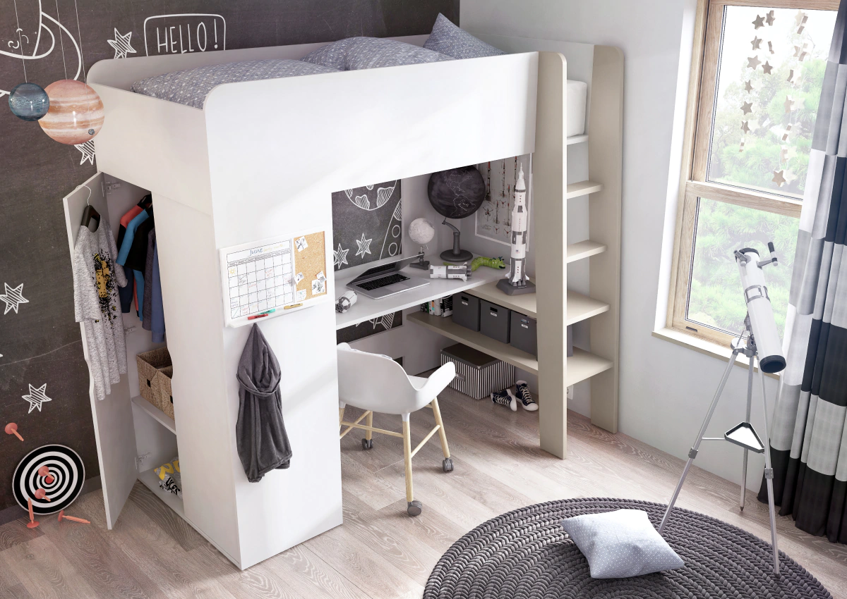 מיטת קומתיים קומפקטית עם מלא מקום לאחסון לחדר ילדים.