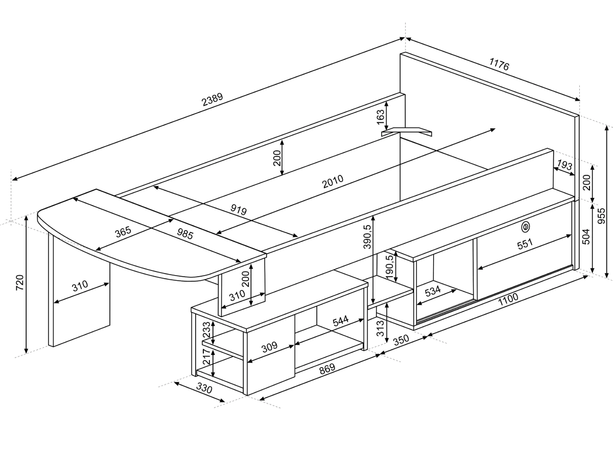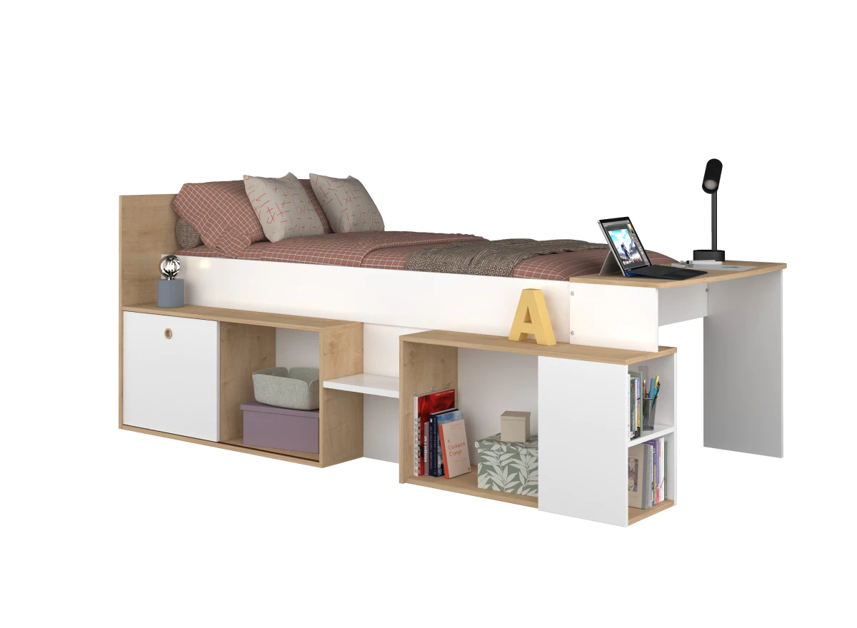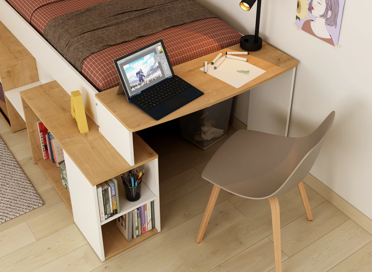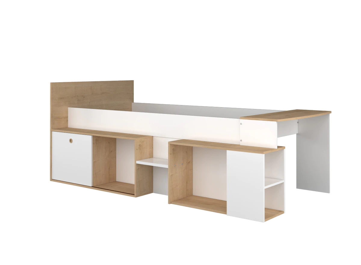 - מיטת יחיד דו צדדית עם שולחן עבודה מובנה. ייתכן ששולחן העבודה פועל צד שמאל או ימין.