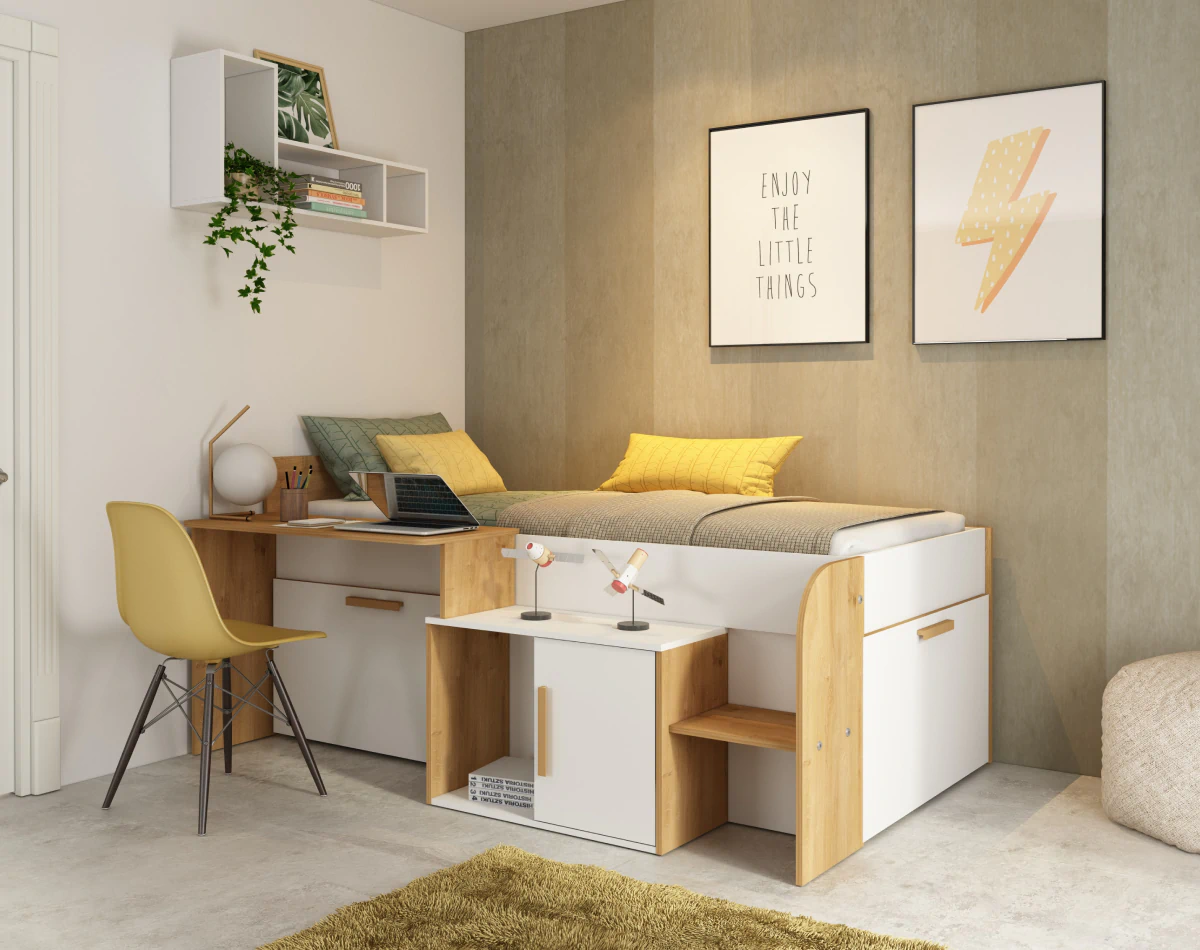 "מיטה חד-מיטה עם שולחן עבודה מובנה – פתרון חסכוני ונוח לחדרים קטנים. שילוב של נוחות, עבודה וסטייל במקום אחד."