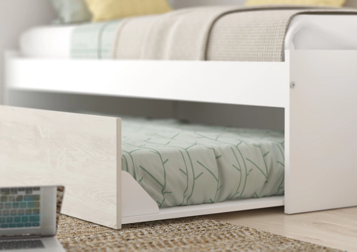 "מיטת ילדים עם מגירות לאחסון ומיטה נוספת לאורחים. פתרון מעולה לחדרי ילדים – נוחות, אחסון ומקום לשינה נוספת."