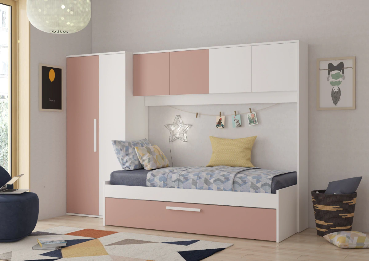 יש מגירה מתחת למיטה ו-4 ארונות מעליה.