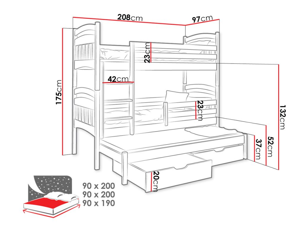 - משטח שינה תחתון: 90 על 190 ס"מ