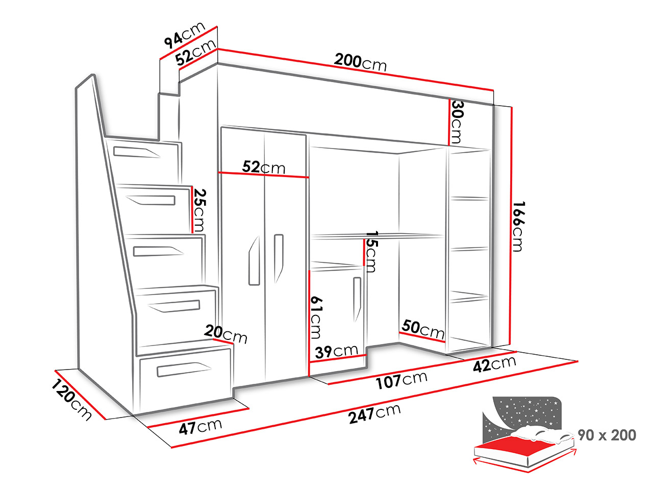 - משטח שינה תחתון: 90 על 190 ס"מ