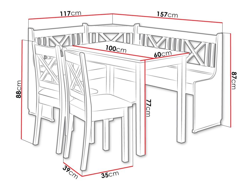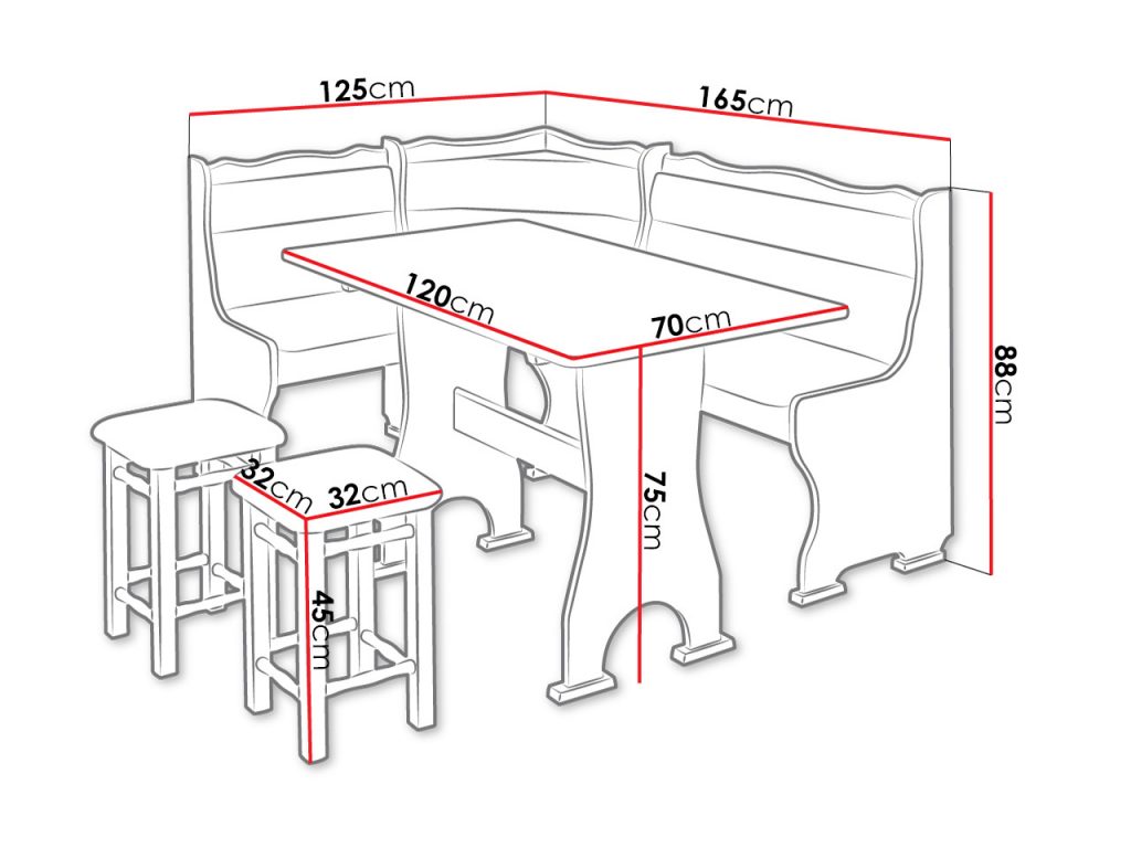 - פינת ספסלים: אורך: 157 ס"מ, רוחב: 117 ס"מ, גובה: 87 ס"מ, מידות מיכל גדול: אורך: 110 ס"מ, רוחב: 25 ס"מ, גובה 10 ס"מ, מידות מיכל קטן: אורך: 70 ס"מ, רוחב : 25 ס"מ, גובה 10 ס"מ,