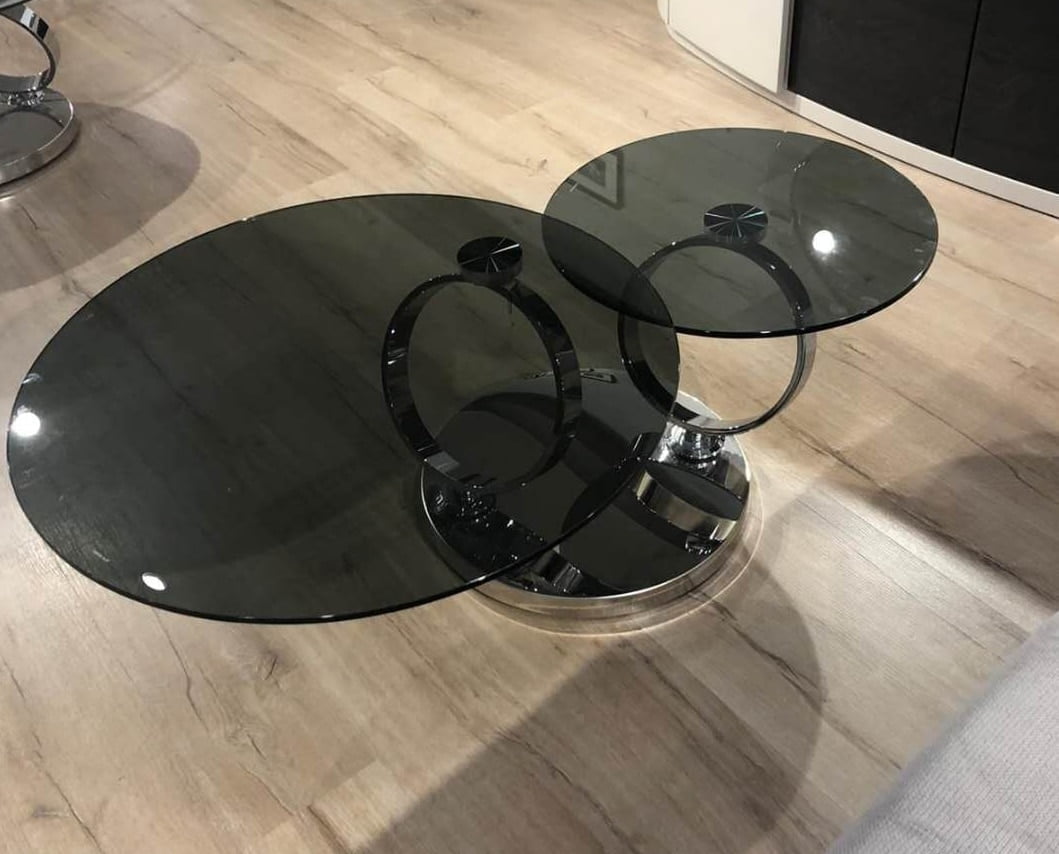 השולחן עשוי מזכוכית מחוסמת בשילוב עם מסגרות ניקל. הזכוכית מסתובבת על ציר ובכך גודל השולחן מתפשט.